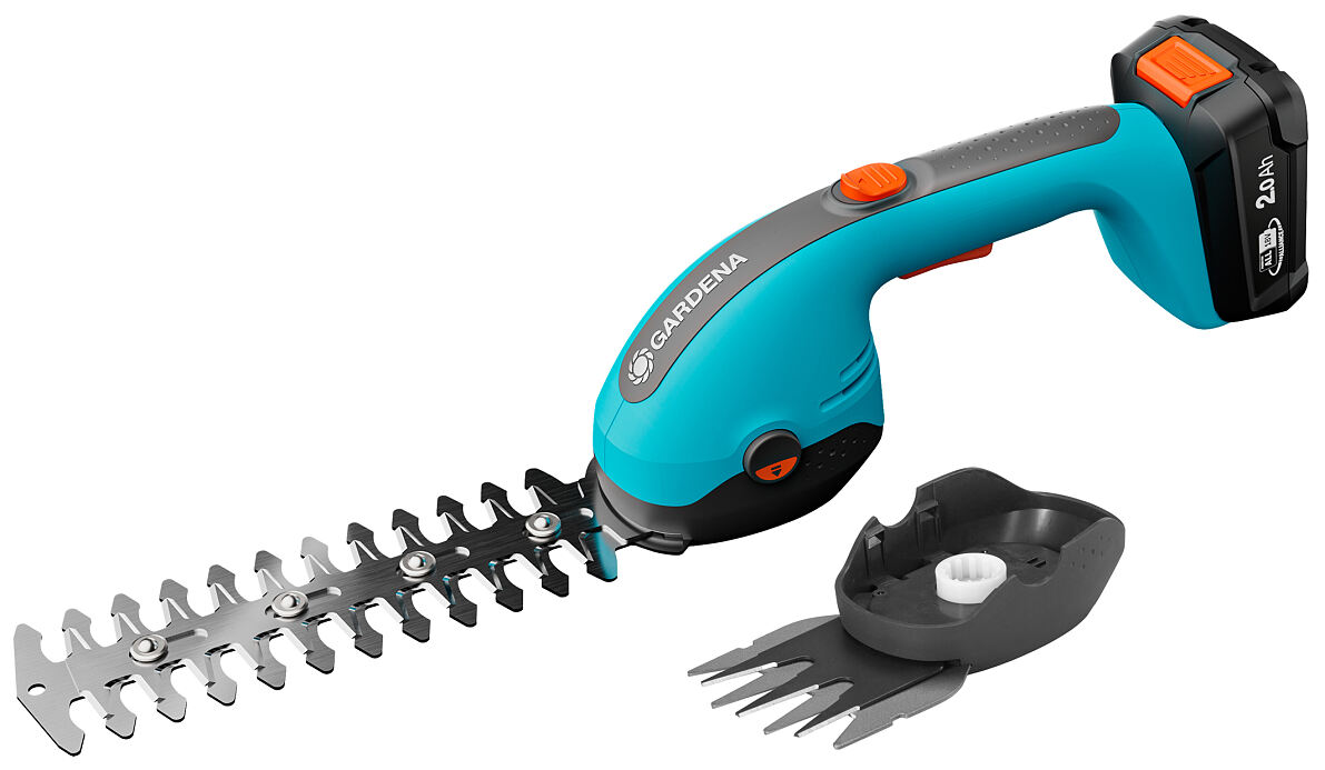 The 8 cm-wide grass and boxwood blades made in Germany are ideal for the precise cutting of lawn edges and boxwood. The 20 cm-long shrub blade is suitable for cutting shrubs and small hedges. With an interchangeable set of blades the device is versatile. The quality blades are durable, precision-ground and can be released and easily replaced at the touch of a button - without the need for any tools. After use, the battery grass and shrub shears can be easily placed vertically on the shelf, to save space.